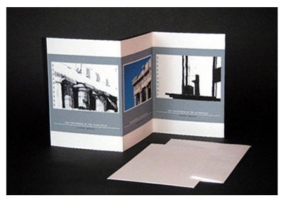 A TWO FOLD, THREE PANEL FORMAT CREATES A DYNAMIC, THREE DIMENSIONAL CARD.